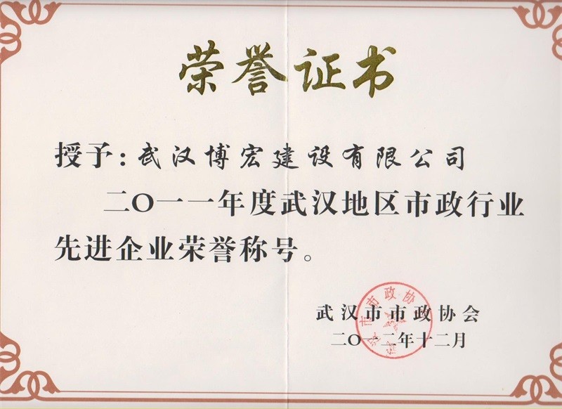 2011年度武漢地區(qū)市政行業(yè)先進(jìn)企業(yè)榮譽(yù)稱(chēng)號(hào)